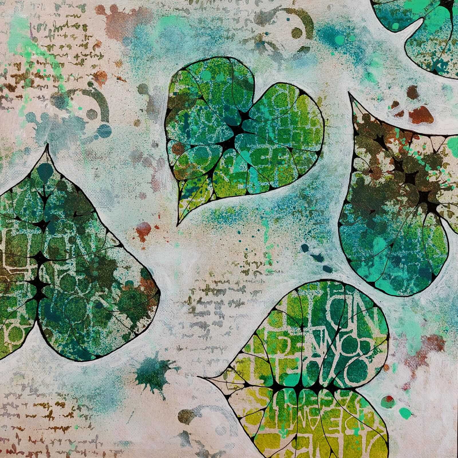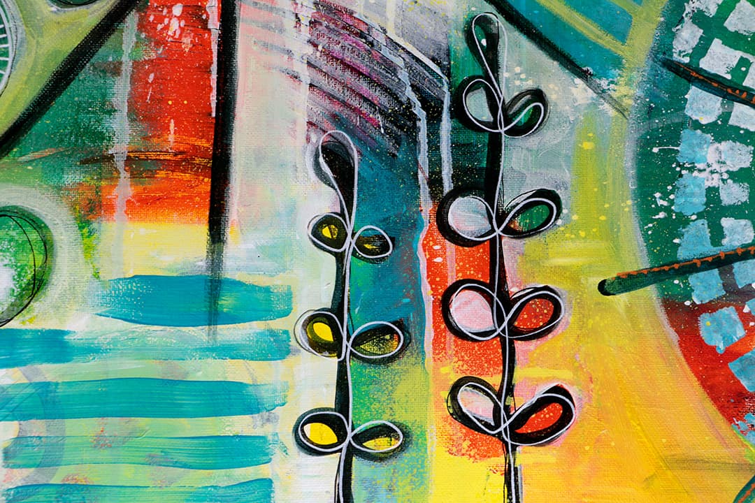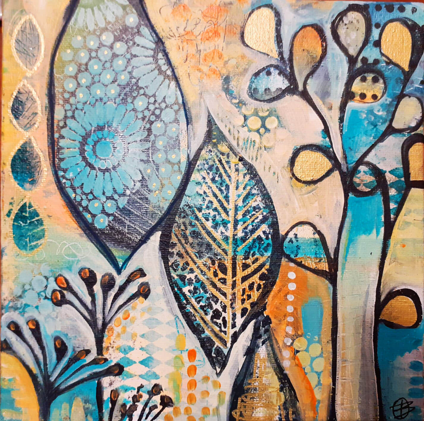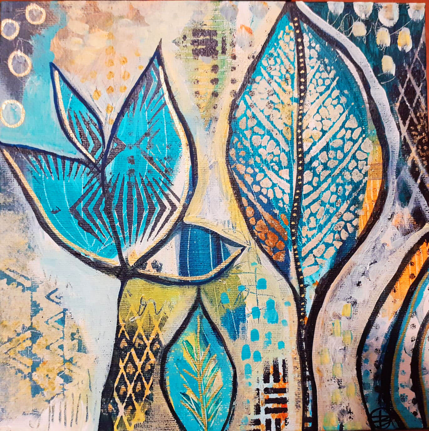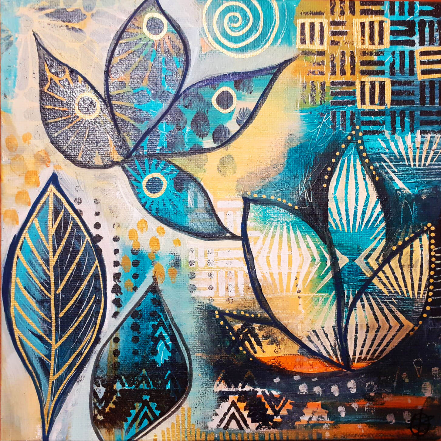 La musique donne un rythme à mes mains qui s’animent. Les premières esquisses naissent alors sur la toile vierge et les premiers coups de pinceau commencent à lui donner vie. J’imprime, je superpose, je gratte, je tamponne, je laisse couler en moi ce qui m’habite et le reste suit son cours naturellement.