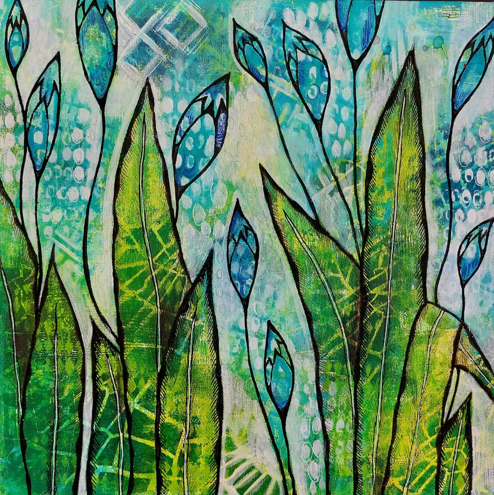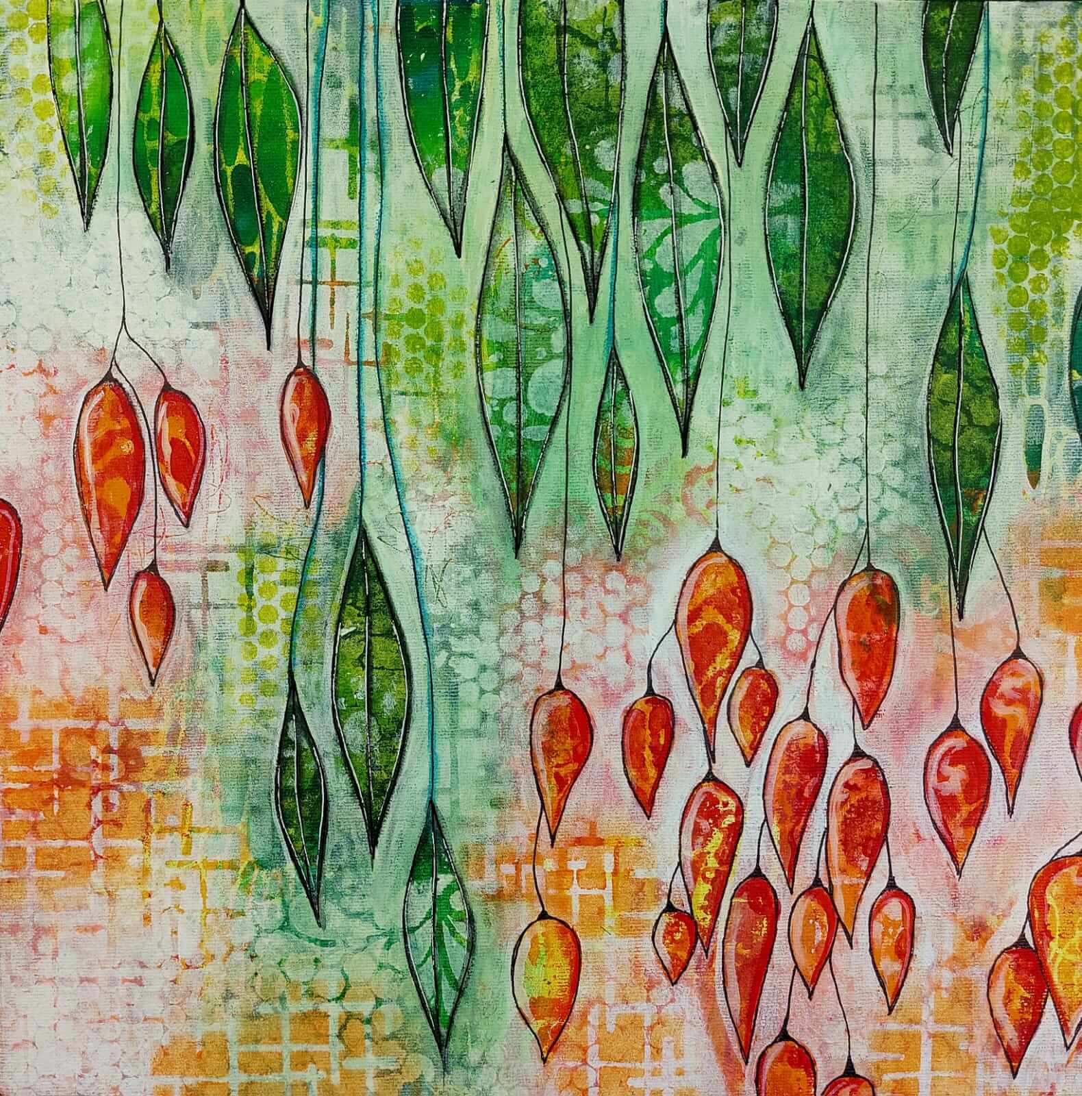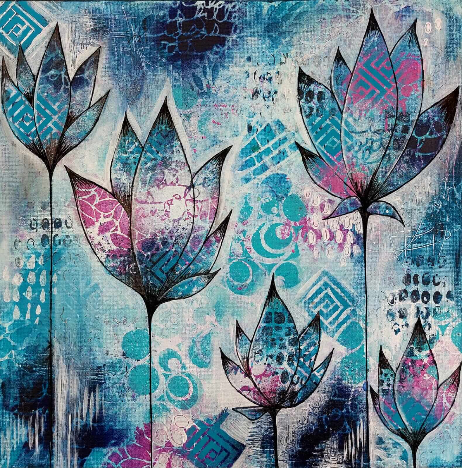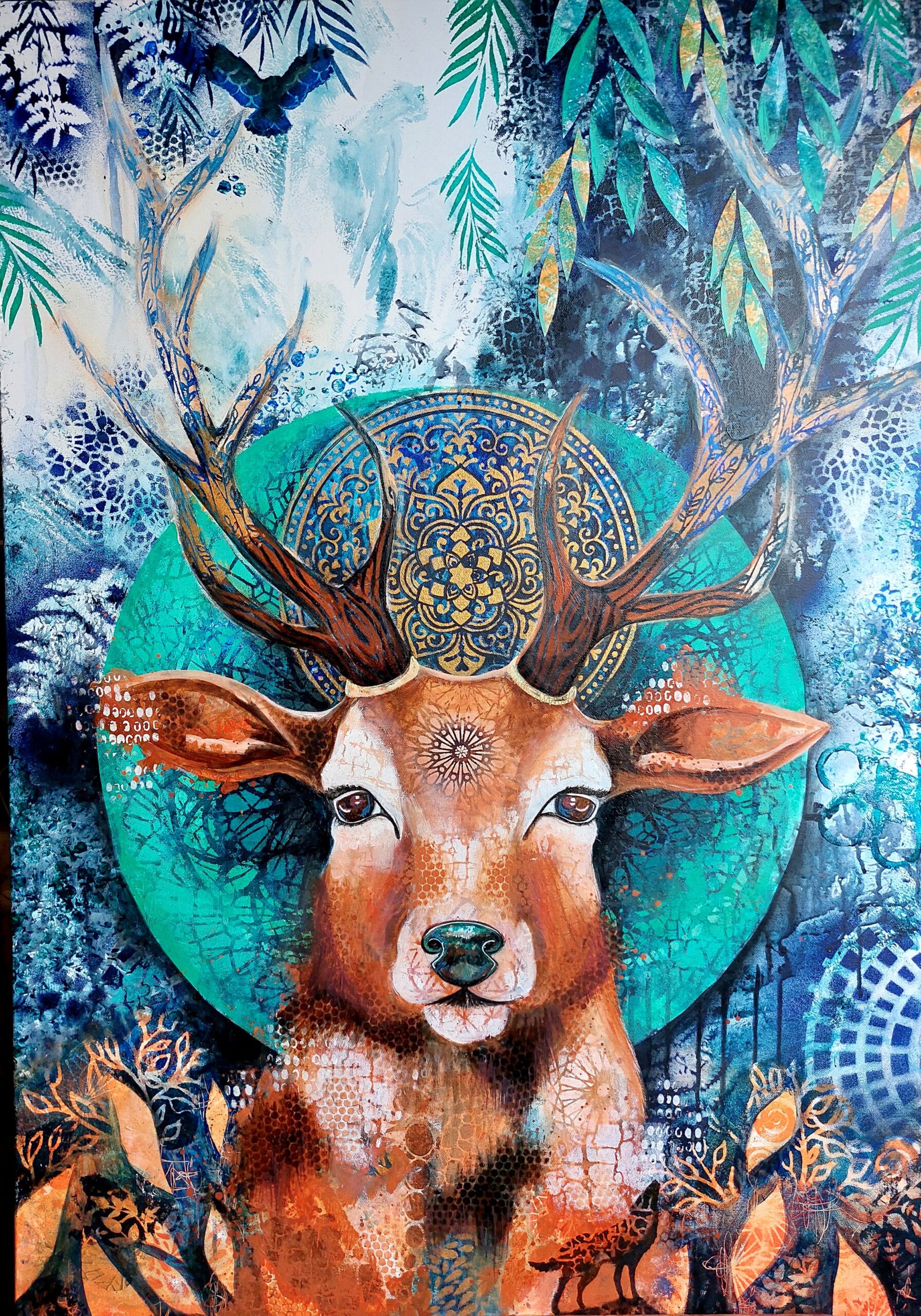 La musique donne un rythme à mes mains qui s’animent. Les premières esquisses naissent alors sur la toile vierge et les premiers coups de pinceau commencent à lui donner vie. J’imprime, je superpose, je gratte, je tamponne, je laisse couler en moi ce qui m’habite et le reste suit son cours naturellement.