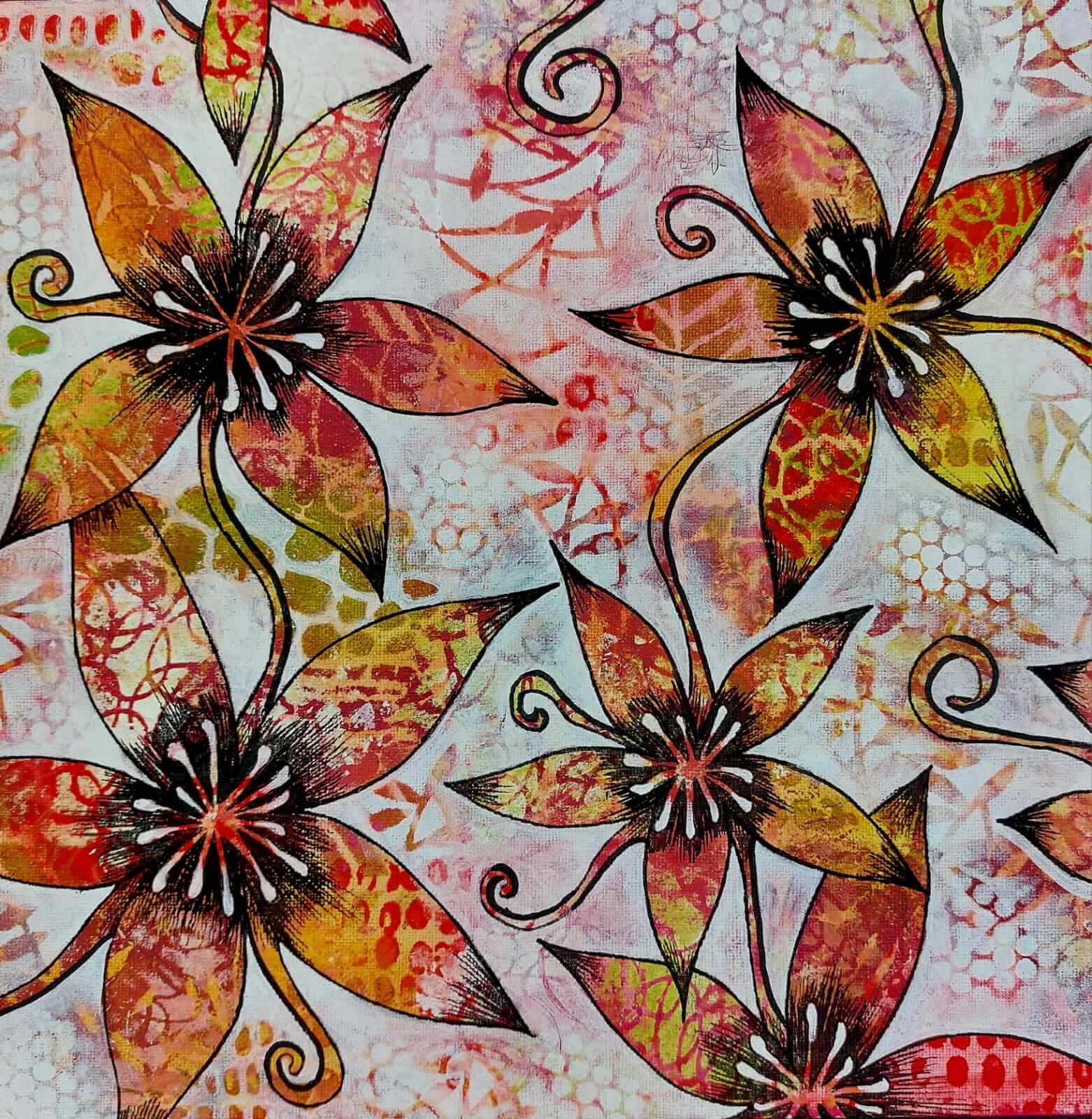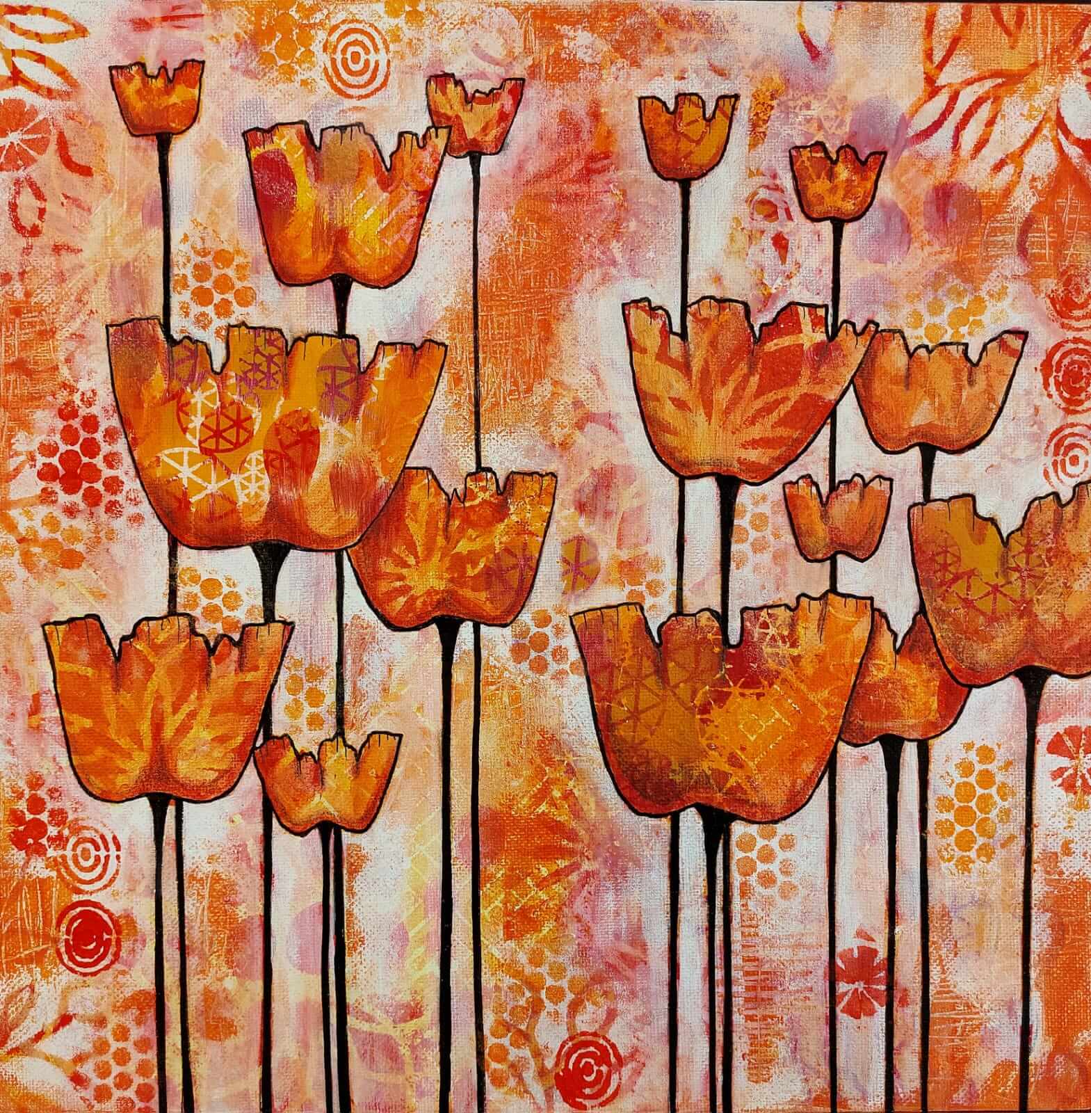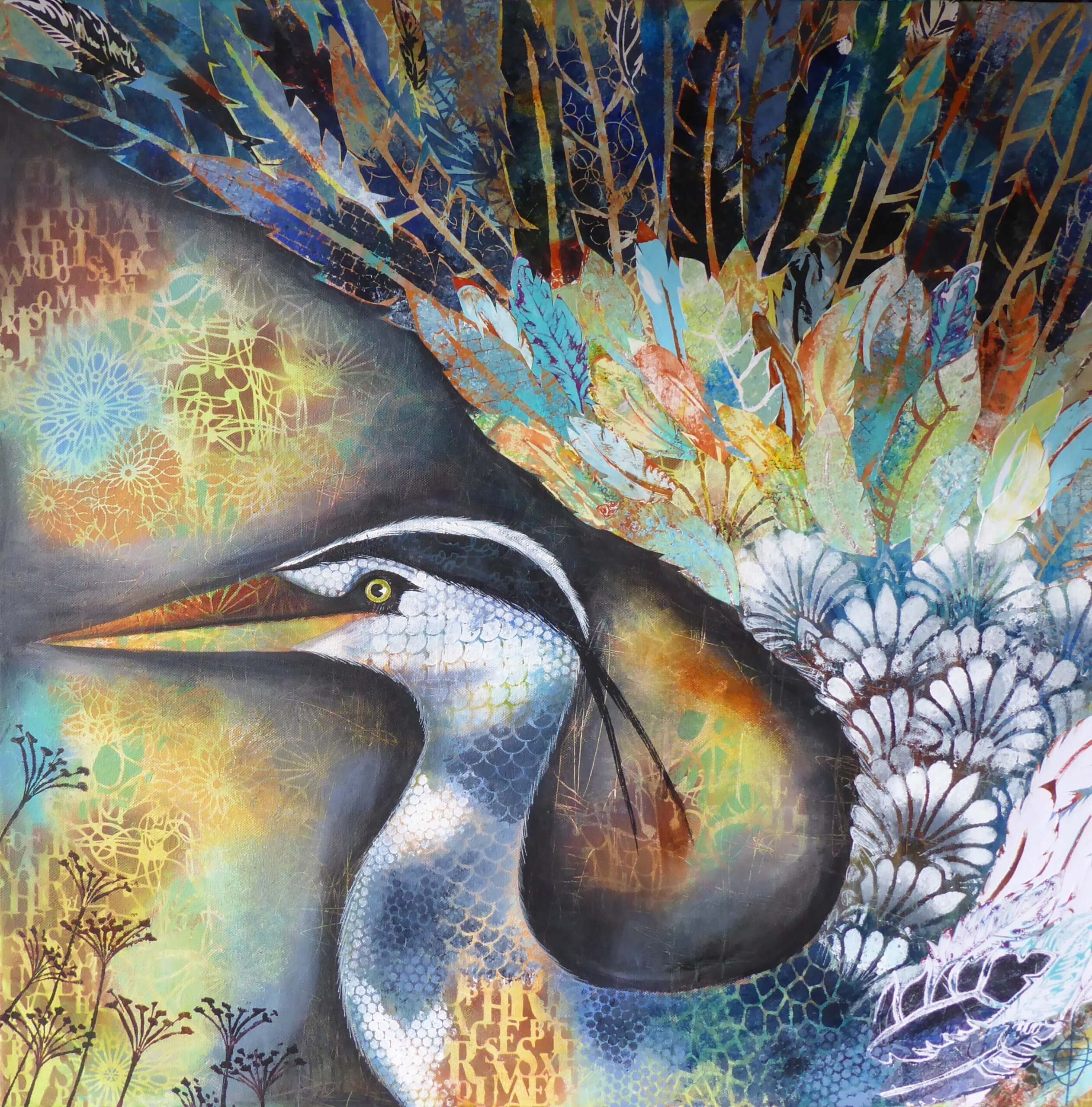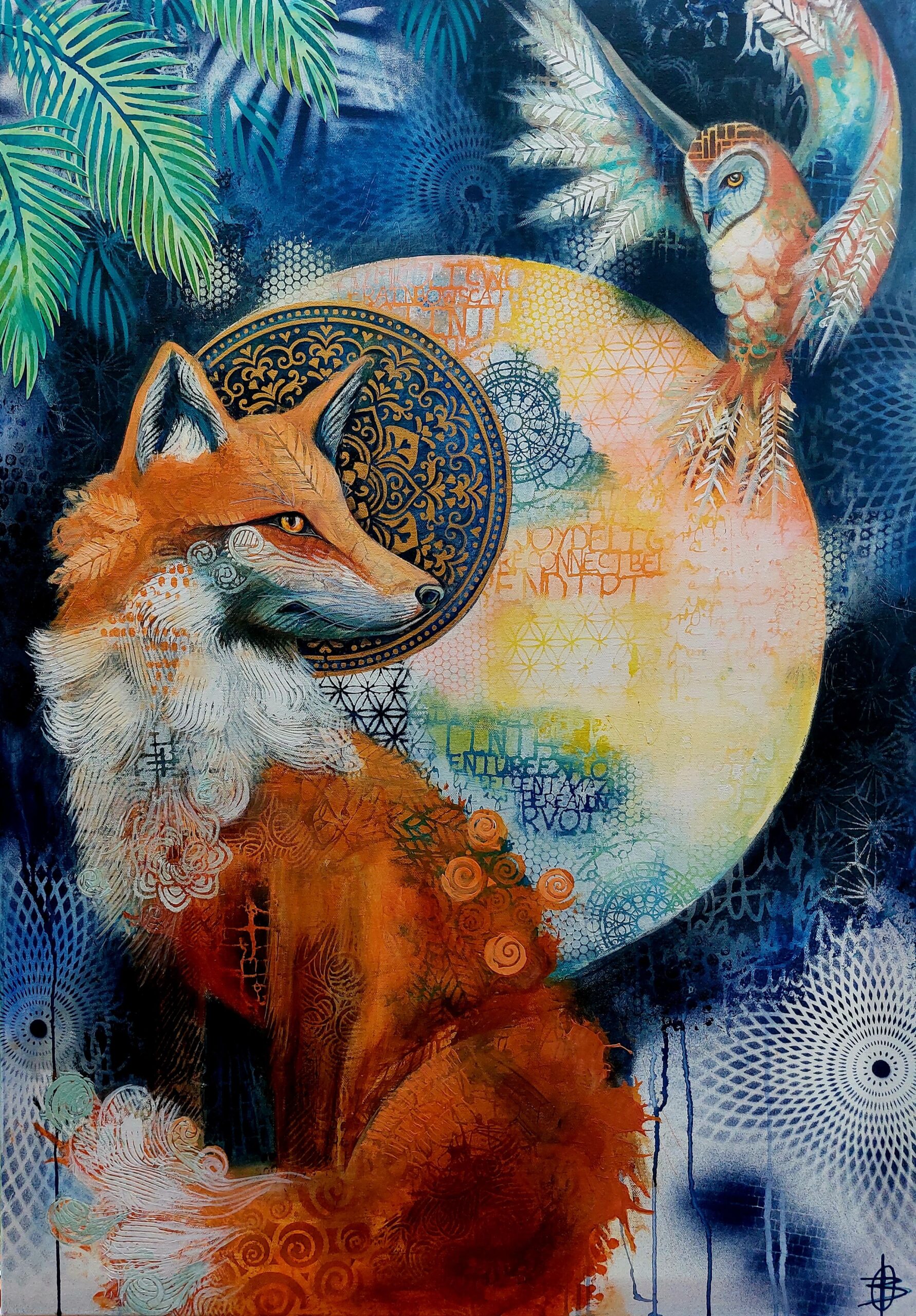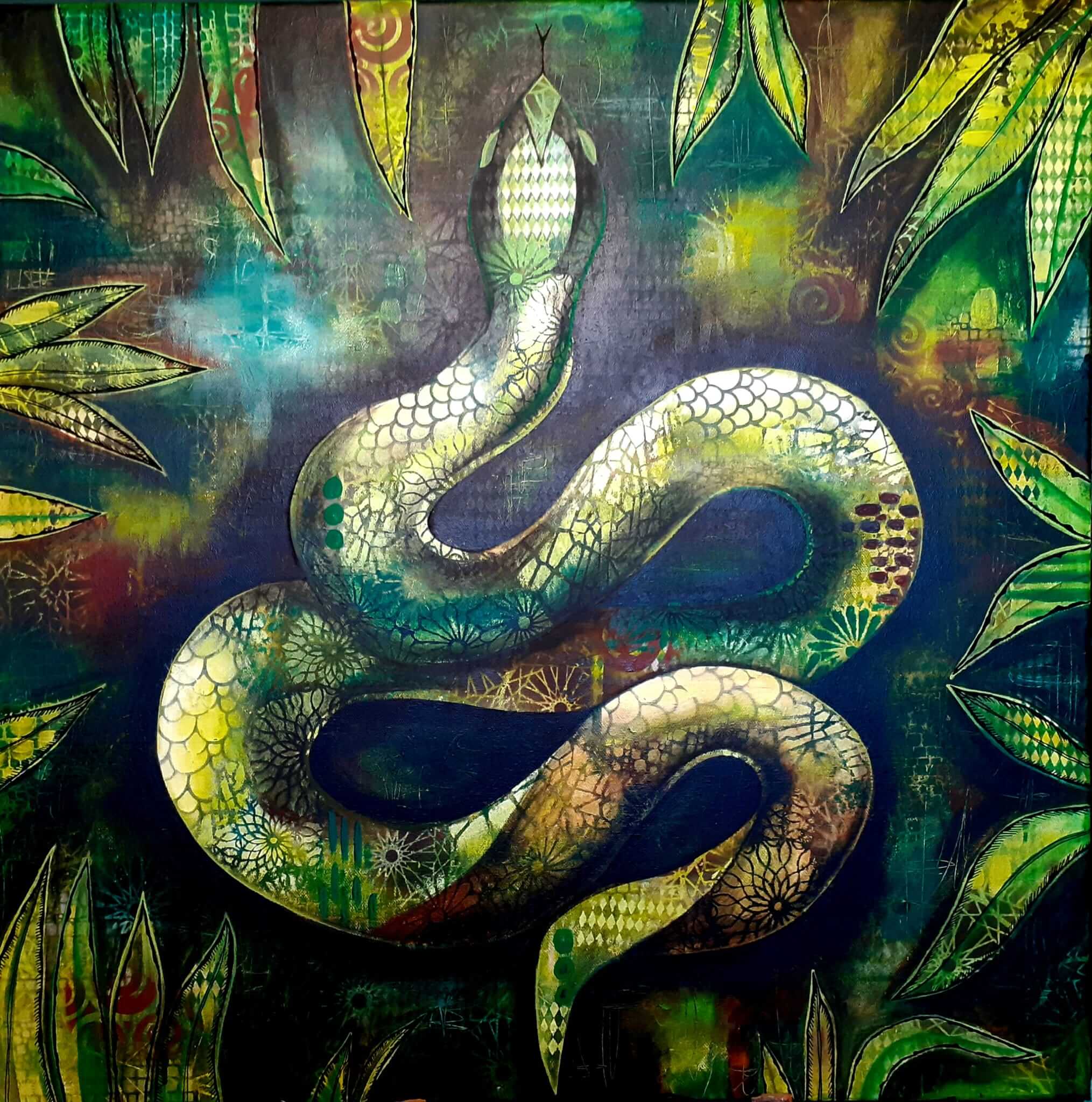 La musique donne un rythme à mes mains qui s’animent. Les premières esquisses naissent alors sur la toile vierge et les premiers coups de pinceau commencent à lui donner vie. J’imprime, je superpose, je gratte, je tamponne, je laisse couler en moi ce qui m’habite et le reste suit son cours naturellement.